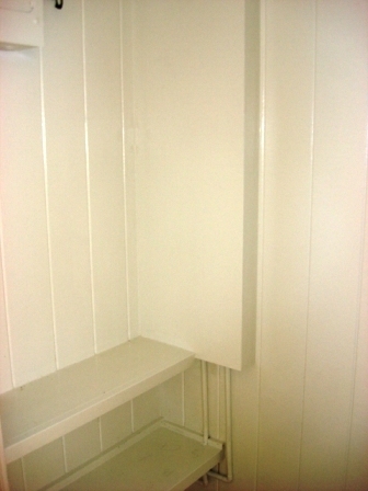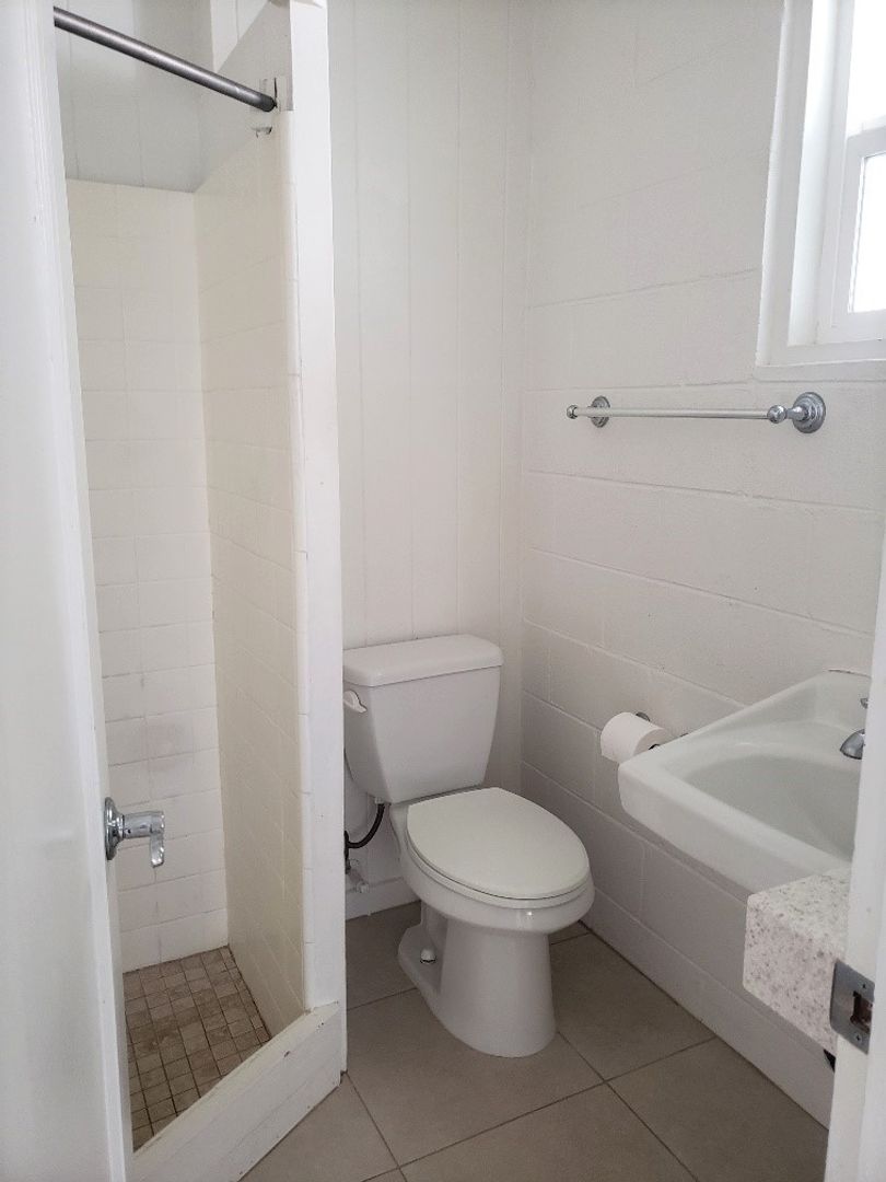 Ground level renovated 1 bed/1 bath with appliances, window coverings, ceramic tiled flooring and a shower stall.