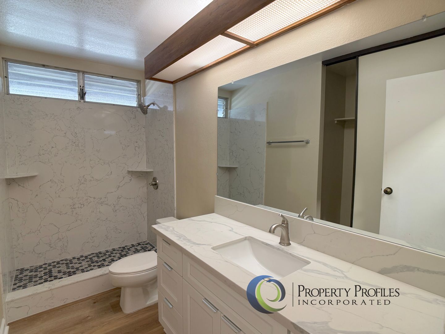 Large renovated 4 Bedroom 2 Bath perimeter lot home in desirable Mililani Town - Available Now! Home features an enclosed garage, large backyard and covered lanai. Renovations include new kitchen & bathroom cabinets & countertops, new showers, & new vinyl plank flooring. Located close to shopping, entertainment, military bases and freeway access. MTA privileges include access to 7 neighborhood Recreation Centers and programs.