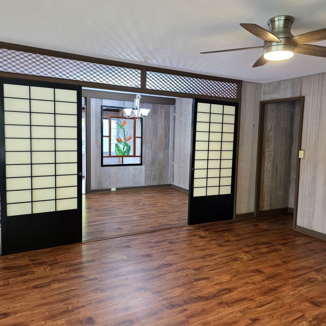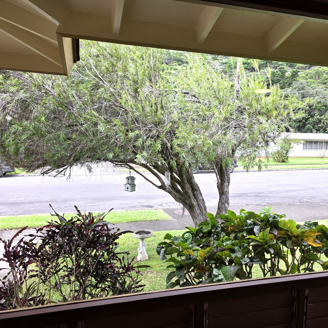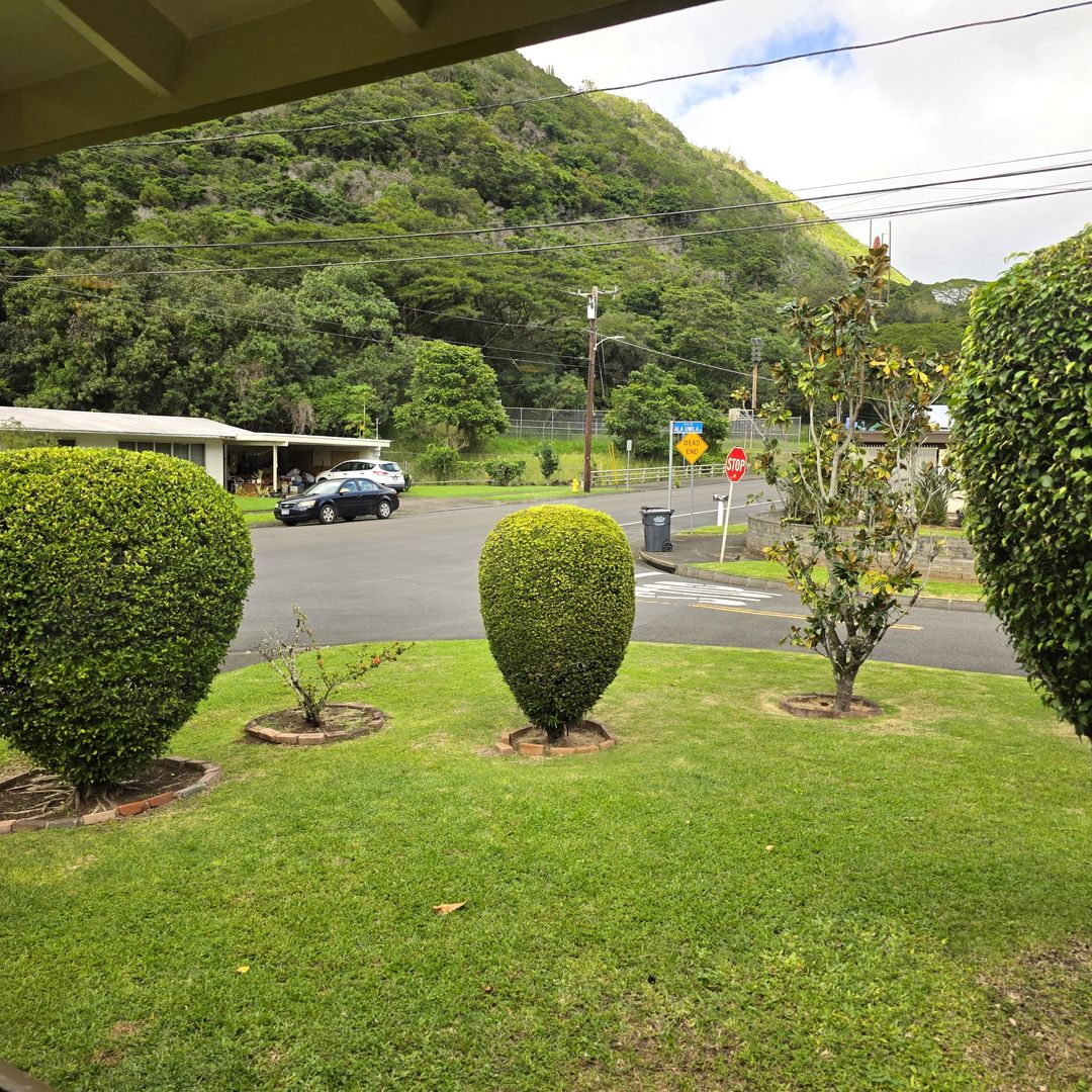 This fully renovated, large single-level duplex home is tucked away at the back of Moanalua Valley, offering peaceful valley views and lush surrounding greenery. Situated on a nicely landscaped corner lot, the one-bedroom, one-bath unit features a spacious living room and an additional family room that can be used as an office, playroom, or guest room. Recent upgrades include newer paint, flooring, quartz countertops, lighting, blinds, and select newer appliances - including full sized washer and dryer in the house. An in-law unit is located at the back of the house and is currently occupied. The garage is shared and includes one covered parking stall, with space for a second vehicle behind it or ample street parking available. Yard service is included, and the owner covers the first $50 of electricity and water/sewer, with the remaining balance split per tenant. Conveniently located near a community park with courts and a hiking trail, this home offers a wonderful and comfortable place to live. Renter's insurance will be required before taking occupancy.