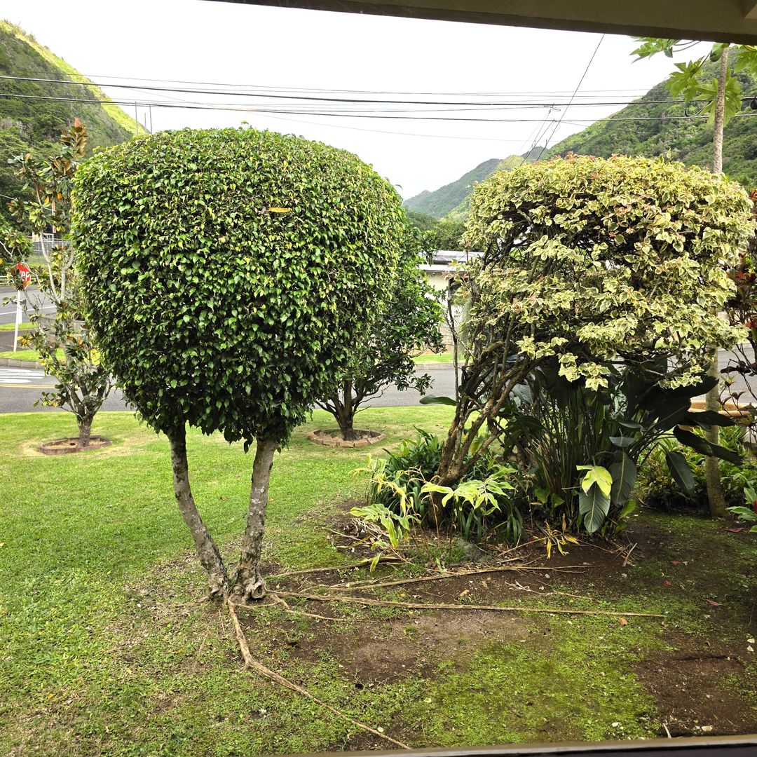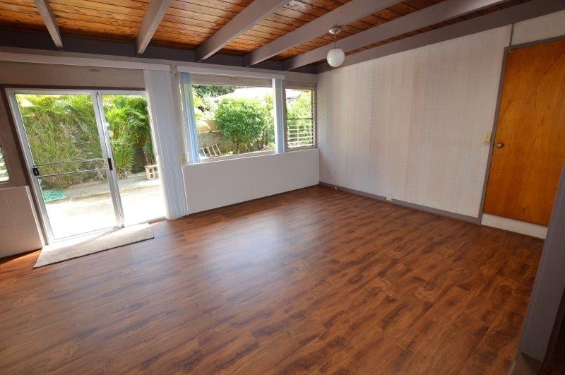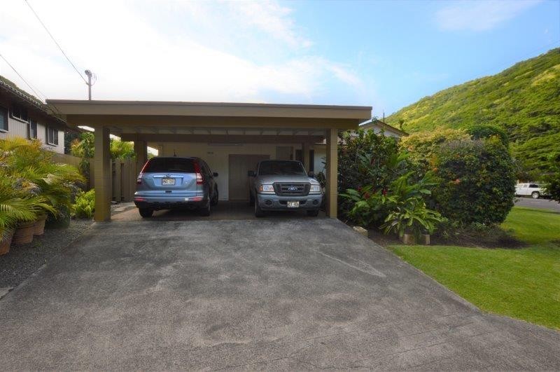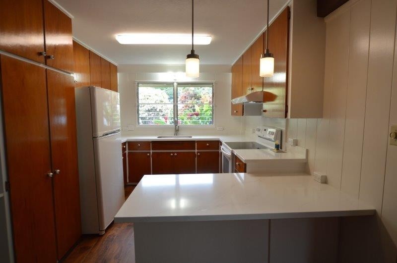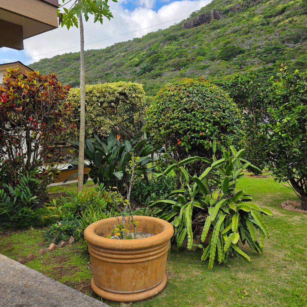 This fully renovated, large single-level duplex home is tucked away at the back of Moanalua Valley, offering peaceful valley views and lush surrounding greenery. Situated on a nicely landscaped corner lot, the one-bedroom, one-bath unit features a spacious living room and an additional family room that can be used as an office, playroom, or guest room. Recent upgrades include newer paint, flooring, quartz countertops, lighting, blinds, and select newer appliances - including full sized washer and dryer in the house. An in-law unit is located at the back of the house and is currently occupied. The garage is shared and includes one covered parking stall, with space for a second vehicle behind it or ample street parking available. Yard service is included, and the owner covers the first $50 of electricity and water/sewer, with the remaining balance split per tenant. Conveniently located near a community park with courts and a hiking trail, this home offers a wonderful and comfortable place to live. Renter's insurance will be required before taking occupancy.